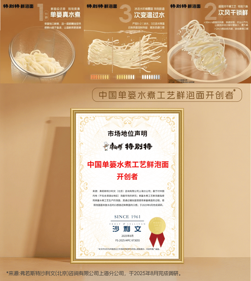 好在市场总是会给予先发者丰厚的回报。康师傅首创的新工艺单篓水煮,不仅被沙利文认证为“中国单篓水煮工艺鲜泡面开创者”,也被行业视为泡面品质升级的标杆性事件。